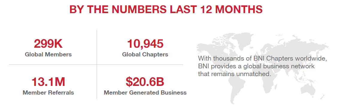 BNI has over 299,000 Members in over 10,945 Chapters and in 76 Countries. In the last 12 months alone, BNI Members generated over 13.1 million valuable business referrals and generated over $20.6 billion (USD) in revenue. We are a Member focused business referral network that works.